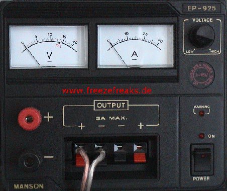 Um gleich nochmal beim Labornetzteil anzusetzen : Ich verwende hier ein Manson EP 925. Das LabNT hat den wirklichen Vorteil einen sehr hohen Strom zwischen 3-16 Volt konstant und sehr genau abzugeben. Mehr Spannung ist bei 90% aller mir bekannten PC-Peltiers eh kaum verwendbar. Die größeren Netzteile sind zudem so teuer, daß sich die Anschaffung nur bei mehrfachen Einsätzen lohnt. Wenn man überhaupt mal von "lohnen" sprechen sollte.