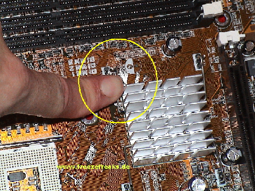 Jetzt nehmen wir unseren präparierten Prozessor vor und setzen ihn vorsichtig in den Sockel ein - Goldkante beachten. Drurch die Paste wird das Einsetzen um einiges schwerer wie zuvor bekannt : Am Besten ist es, den Prozessor mit leicht geneigter Lage in die erste PIN-Reihe einsacken zu lassen und dann sofort den hinteren Teil hinterherkippen zu lassen. Wenn man sicher ist, daß der Prozessor richtig sitzt => FEST andrücken.