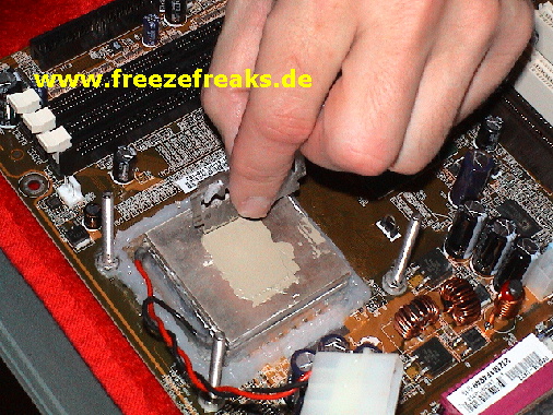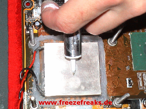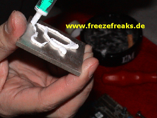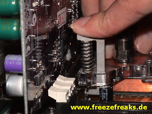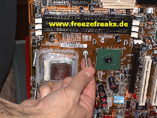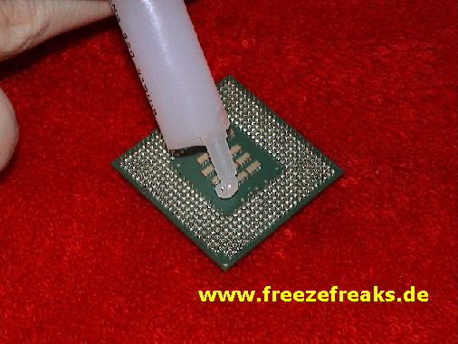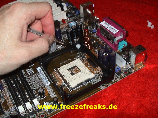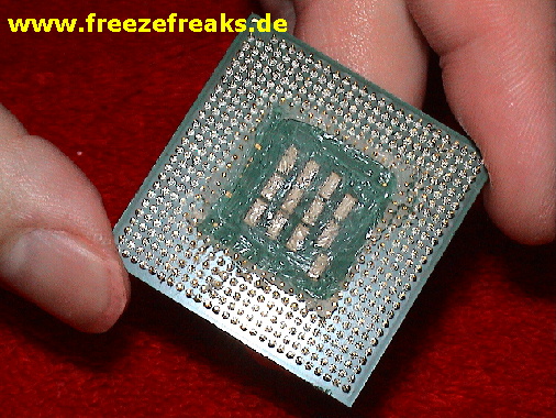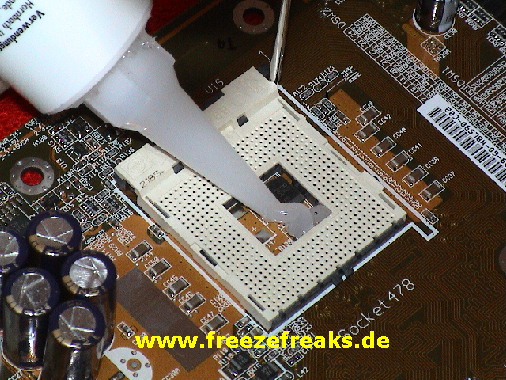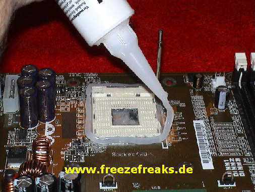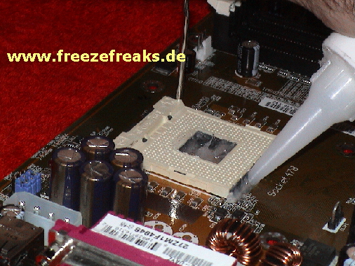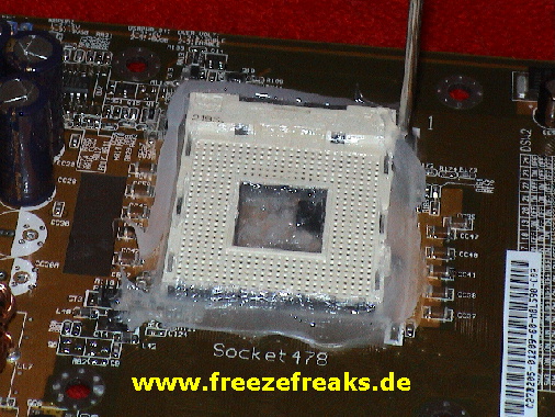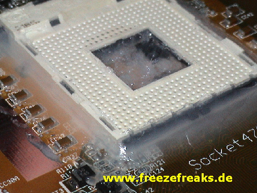Dieser Arbeitsgang ist enorm wichtig. Er verhindert die mögliche Bildung von Kondenswasser im Sockel an den PINS der CPU. Wer hier schludert oder diesen Arbeitsgang asulässt => Selber schuld, aber schickt mir Eure Bilder der abgrauchten CPUs doch bitte zu, ich suche immer warnende Beispiele... (Dieser Arbeitsgang ist auch beim Prometeia und Vapochill ein absolutes MUß!)
