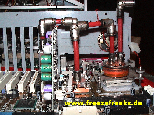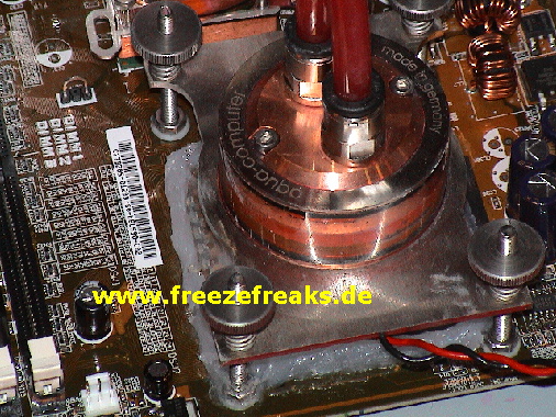Auch dieser Punkt ist wichtig. Falls Kondenswasser entstehen sollte, müssen wir ja alles tun, um es vom Sockel und dem Prozessor wegzubekommen. Das Auffanfbecken ist sicherlich nur bei waagrechten Boards nötig, aber bei senkrecht eingebauten Boards würde ich genauso eine "Triefnase" und eine Beschichtung des Boards unterhalb des Sockels in Fließrichtung des Wassers anraten...